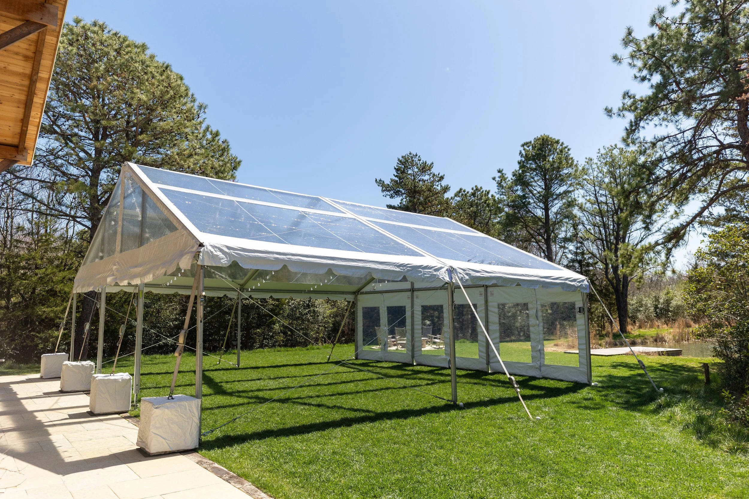 Full clear top tent with clear gabled ends, bistro lighting, and clear sidewalls—perfect for letting the outdoors shine through.