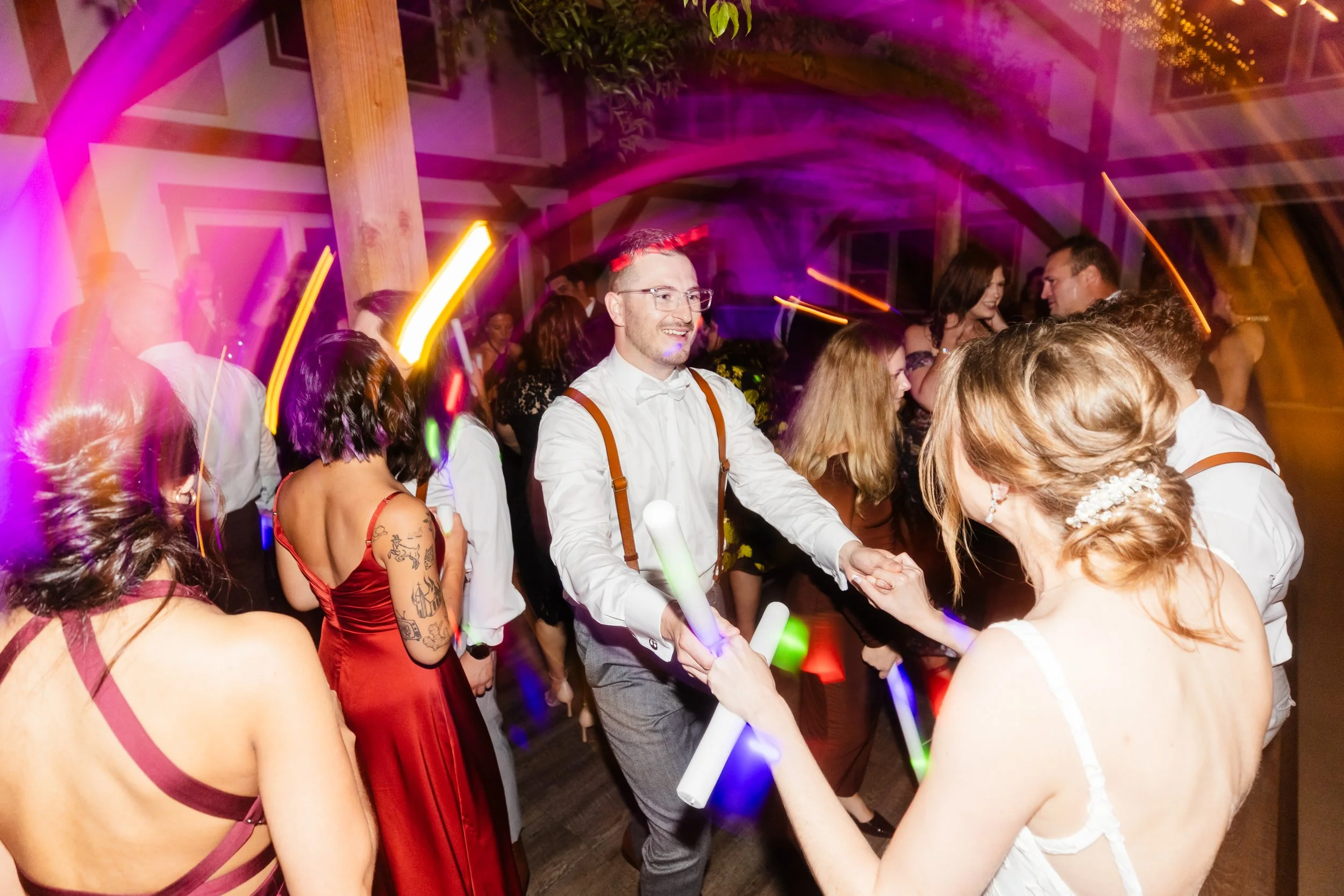 Create the perfect ambiance with custom lighting options like bistro lighting, twinkle string lights, and uplighting—one of the easiest and most effective ways to transform your space. Whether you’re aiming for soft romance or a vibrant, party-ready glow, uplighting adds depth, color, and atmosphere that takes your celebration to the next level.